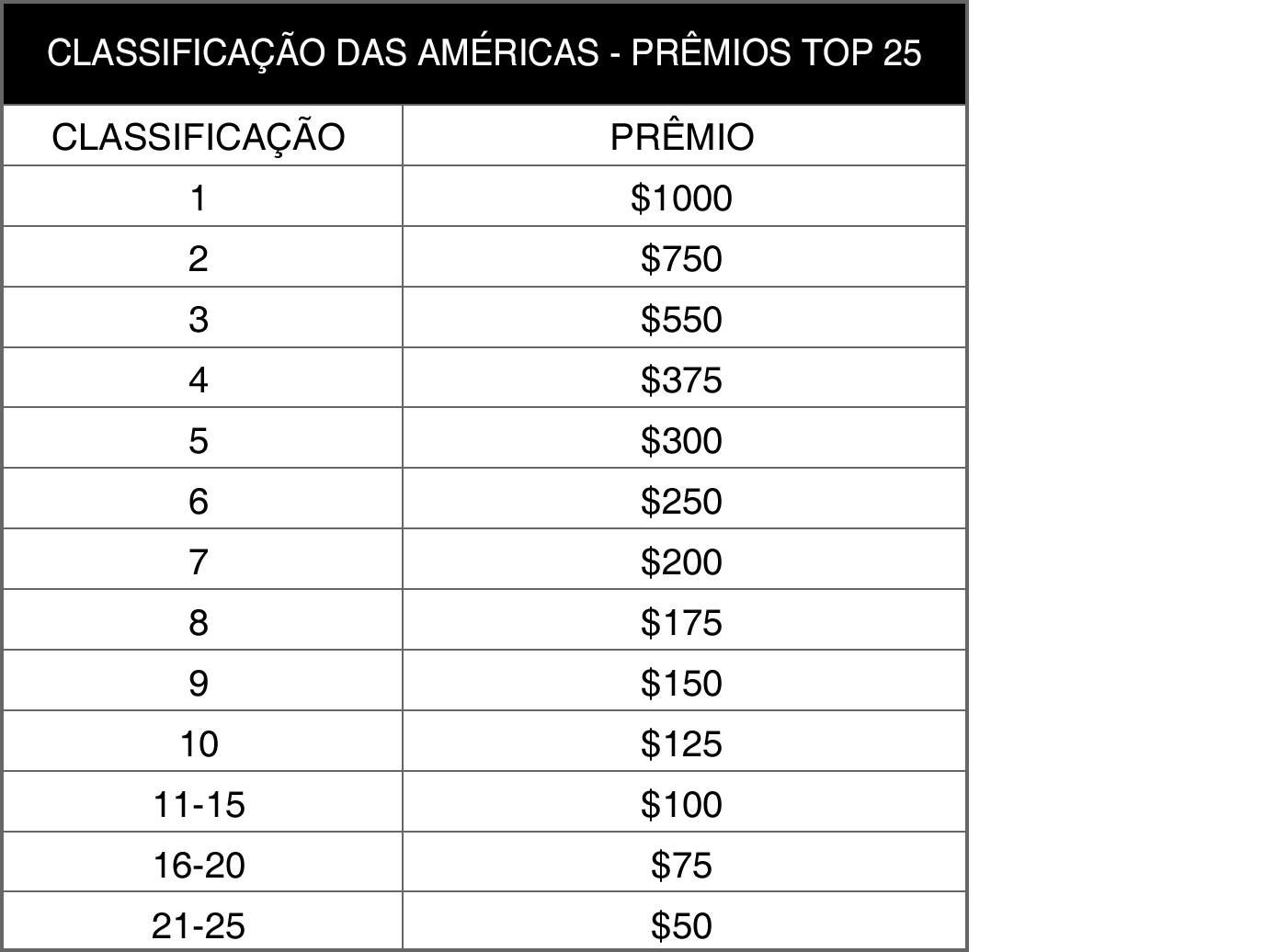 Após concluído o último torneio de tabela de classificação das Américas, os 25 melhores finalistas classificados serão recompensados com um(s) prêmio(s). Todos os jogadores que empatarem e tiverem os mesmos pontos com o finalista no 25° lugar também serão elegíveis para a recompensa do prêmio.